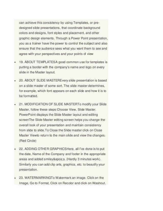 5. 5. can achieve this consistency by using Templates, or pre-designed slide presentations, that coordinate backgroundcolors and designs, font styles and placement, and othergraphic design elements. Through a Power Point presentation,you as a trainer have the power to control the subject and alsoensure that the audience sees what you want them to see andagree with your perspectives and your points of view19. ABOUT TEMPLATESA good common use for templates isputting a border with the companys name and logo on everyslide in the Master layout.20. ABOUT SLIDE MASTEREvery slide presentation is basedon a slide master of some sort. The slide master determines,for example, which font appears on each slide and how it is tobe formatted.21. MODIFICATION OF SLIDE MASTERTo modify your SlideMaster, follow these steps:Choose View, Slide Master.PowerPoint displays the Slide Master layout and editingscreenThe Slide Master editing screen helps you change theoverall look of your presentation and maintain consistencyfrom slide to slide.To Close the Slide master click on CloseMaster Viewto return to the main slide and view the changes.(Red Circle)22. ADDING OTHER GRAPHICSHere, all I’ve done is to putthe date, Name of the Company and footer in the appropriateareas and added smiley's. (Hardly 3 minutes work).Similarly you can add clip arts, graphics, etc. to beautify yourpresentation.23. WATERMARKINGTo Watermark an image. Click on theImage, Go to Format, Click on Recolor and click on Washout.