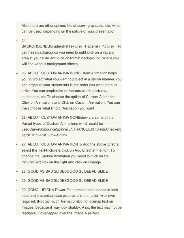 6. 6. Also there are other options like shadow, grayscale, etc. whichcan be used, depending on the nature of your presentation24.BACKGROUNDSGradientFillTextureFillPatternFillPictureFillToget these backgrounds you need to right click on a vacantarea in your slide and click on format background, where youwill find various background effects25. ABOUT CUSTOM ANIMATIONCustom Animation helpsyou to project what you want to project in a stylish manner.Youcan organize your statements in the order you want them toarrive.You can emphasize on various words, pictures,statements, etc.To choose the option of Custom Animation,Click on Animations and Click on Custom Animation. You canthen choose what kind of Animation you want26. ABOUT CUSTOM ANIMATIONBelow are some of theVaried types of Custom Animations which could beusedCurveUpBounceSpinnerENTRANCEEXITBlindsCheckerboardEMPHASISGrow/Shrink27. ABOUT CUSTOM ANIMATIONTo Add the above Effects,select the Text/Picture & click on Add Effect at the right.Tochange the Custom Animation you need to click on thePicture/Text Box on the right and click on Change28. GOOD VS BAD SLIDESGOOD SLIDEBAD SLIDE29. GOOD VS BAD SLIDESGOOD SLIDEBAD SLIDE30. CONCLUSIONA Power Point presentation needs to lookneat and presentableUse pictures and animation whereverrequired. (Not too much Animation)Do not overlap text onImages, because it may look shabby. Also, the text may not bereadable, if overlapped over the Image.A perfect