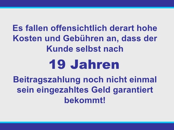 9. 10. Es fallen offensichtlich derart hohe Kosten und Gebühren an, dass der Kunde selbst nach 19 Jahren Beitragszahlung noch nicht einmal sein eingezahltes Geld garantiert bekommt!