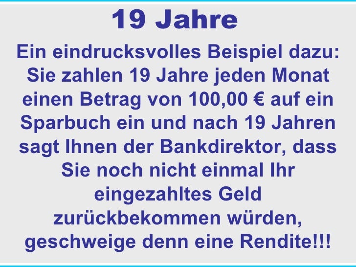 11. 12. 19 Jahre Ein eindrucksvolles Beispiel dazu: Sie zahlen 19 Jahre jeden Monat einen Betrag von 100,00 € auf ein Sparbuch ein und nach 19 Jahren sagt Ihnen der Bankdirektor, dass Sie noch nicht einmal Ihr eingezahltes Geld zurückbekommen würden, geschweige denn eine Rendite!!!