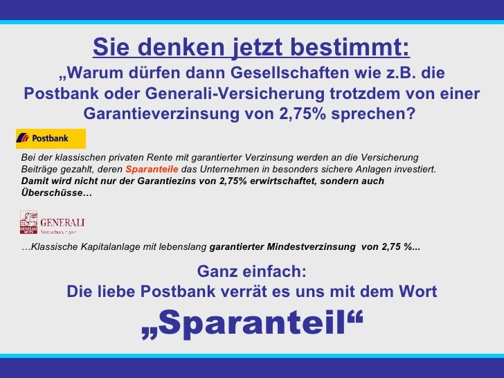12. 13. Sie denken jetzt bestimmt: „ Warum dürfen dann Gesellschaften wie z.B. die Postbank oder Generali-Versicherung trotzdem von einer Garantieverzinsung von 2,75% sprechen? Bei der klassischen privaten Rente mit garantierter Verzinsung werden an die Versicherung Beiträge gezahlt, deren Sparanteile das Unternehmen in besonders sichere Anlagen investiert. Damit wird nicht nur der Garantiezins von 2,75% erwirtschaftet, sondern auch Überschüsse… … Klassische Kapitalanlage mit lebenslang garantierter Mindestverzinsung von 2,75 %... Ganz einfach: Die liebe Postbank verrät es uns mit dem Wort „Sparanteil“