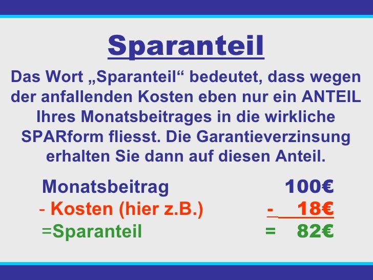 13. 14. Sparanteil Das Wort „Sparanteil“ bedeutet, dass wegen der anfallenden Kosten eben nur ein ANTEIL Ihres Monatsbeitrages in die wirkliche SPARform fliesst. Die Garantieverzinsung erhalten Sie dann auf diesen Anteil. Monatsbeitrag 100€ - Kosten (hier z.B.) - 18€ = Sparanteil = 82€