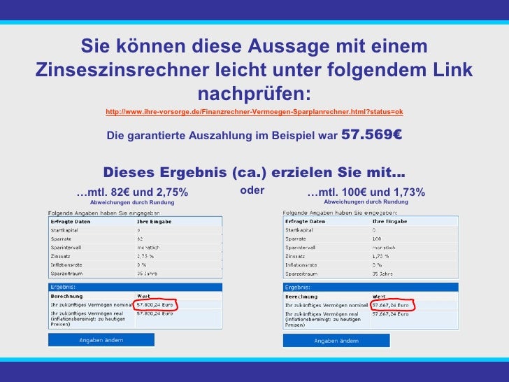 14. 15. Sie können diese Aussage mit einem Zinseszinsrechner leicht unter folgendem Link nachprüfen: http://www.ihre-vorsorge.de/Finanzrechner-Vermoegen-Sparplanrechner.html?status=ok … mtl. 82€ und 2,75% Abweichungen durch Rundung … mtl. 100€ und 1,73% Abweichungen durch Rundung Die garantierte Auszahlung im Beispiel war 57.569€ Dieses Ergebnis (ca.) erzielen Sie mit… oder
