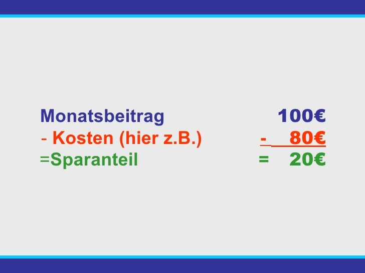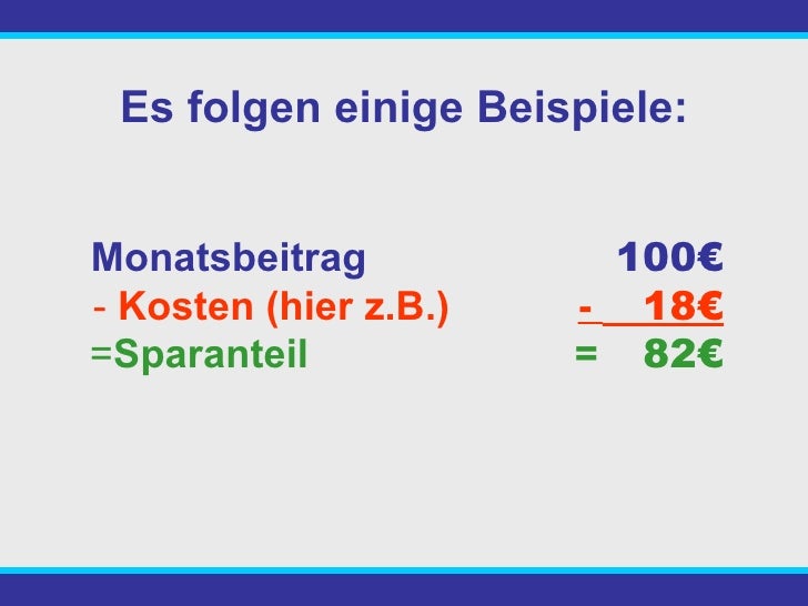 20. 21. Monatsbeitrag 100€ - Kosten (hier z.B.) - 18€ = Sparanteil = 82€ Es folgen einige Beispiele: