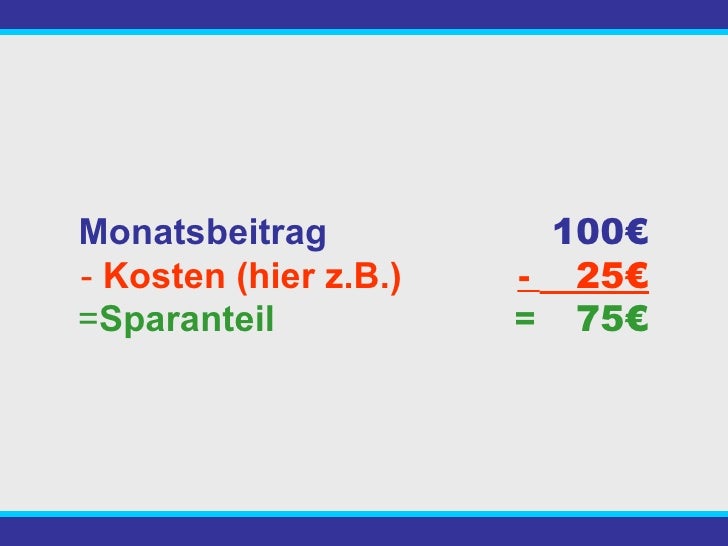 22. 23. Monatsbeitrag 100€ - Kosten (hier z.B.) - 25€ = Sparanteil = 75€