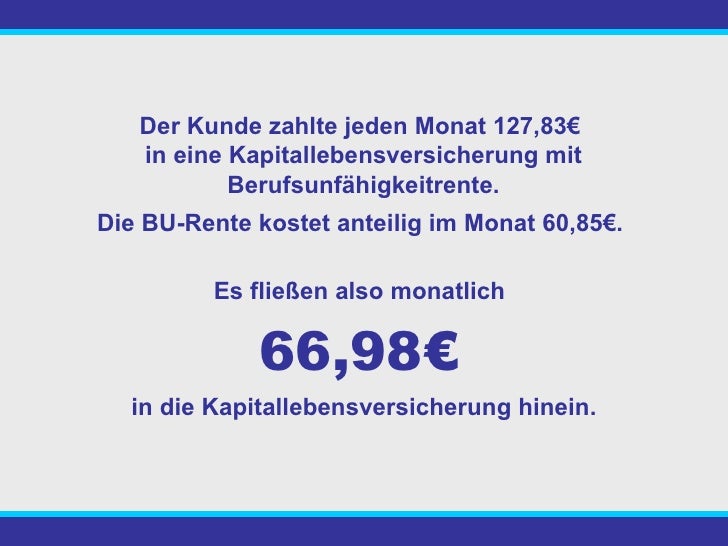 26. 27. Der Kunde zahlte jeden Monat 127,83€ in eine Kapitallebensversicherung mit Berufsunfähigkeitrente. Die BU-Rente kostet anteilig im Monat 60,85€. Es fließen also monatlich 66,98€ in die Kapitallebensversicherung hinein.