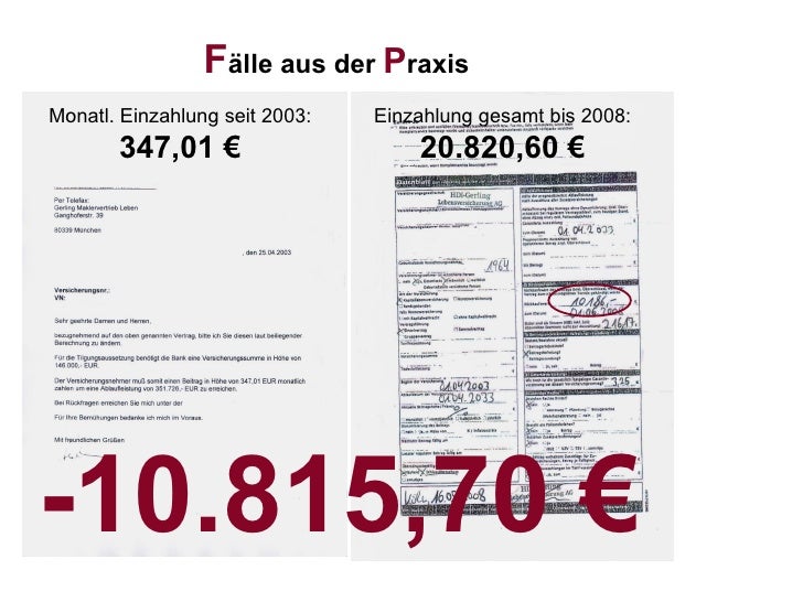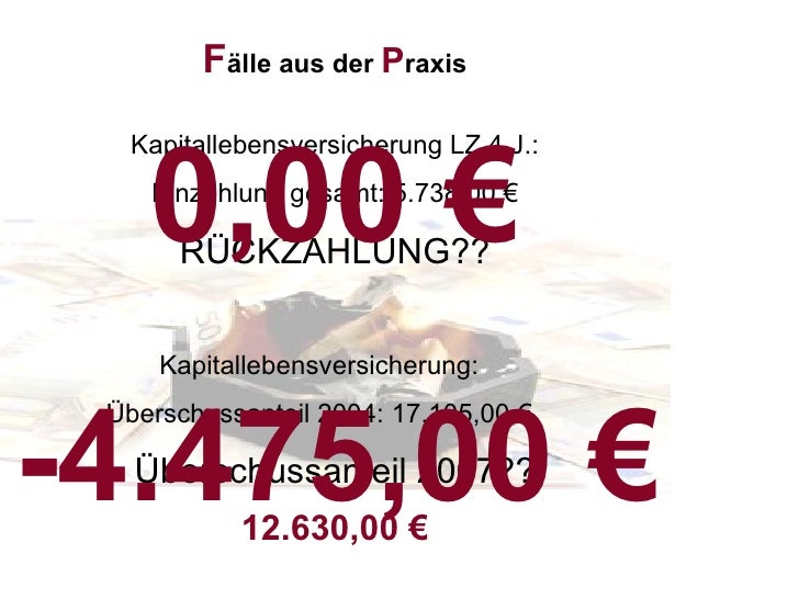 35. 36. F älle aus der P raxis Kapitallebensversicherung LZ 4 J.: Einzahlung gesamt: 5.738,00 € RÜCKZAHLUNG?? 0,00 € Kapitallebensversicherung: Überschussanteil 2004: 17.105,00 € Überschussanteil 2007?? 12.630,00 € -4.475,00 €