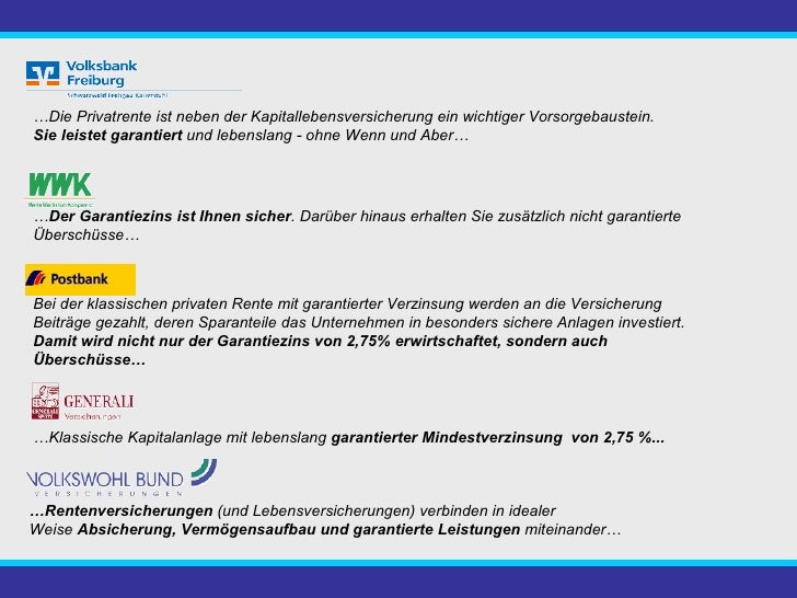 3. 4. … Die Privatrente ist neben der Kapitallebensversicherung ein wichtiger Vorsorgebaustein. Sie leistet garantiert und lebenslang - ohne Wenn und Aber… … Der Garantiezins ist Ihnen sicher . Darüber hinaus erhalten Sie zusätzlich nicht garantierte Überschüsse… Bei der klassischen privaten Rente mit garantierter Verzinsung werden an die Versicherung Beiträge gezahlt, deren Sparanteile das Unternehmen in besonders sichere Anlagen investiert. Damit wird nicht nur der Garantiezins von 2,75% erwirtschaftet, sondern auch Überschüsse… … Klassische Kapitalanlage mit lebenslang garantierter Mindestverzinsung von 2,75 %... … Rentenversicherungen (und Lebensversicherungen) verbinden in idealer Weise Absicherung, Vermögensaufbau und garantierte Leistungen miteinander…