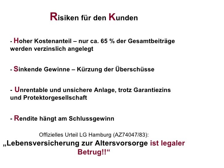 42. 44. R isiken für den K unden - H oher Kostenanteil – nur ca. 65 % der Gesamtbeiträge werden verzinslich angelegt - U nrentable und unsichere Anlage, trotz Garantiezins und Protektorgesellschaft - R endite hängt am Schlussgewinn - S inkende Gewinne – Kürzung der Überschüsse Offizielles Urteil LG Hamburg (AZ74047/83): „Lebensversicherung zur Altersvorsorge ist legaler Betrug!!“