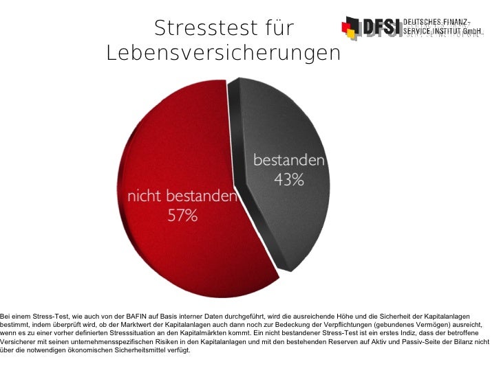 43. 45. Stresstest für Lebensversicherungen Bei einem Stress-Test, wie auch von der BAFIN auf Basis interner Daten durchgeführt, wird die ausreichende Höhe und die Sicherheit der Kapitalanlagen bestimmt, indem überprüft wird, ob der Marktwert der Kapitalanlagen auch dann noch zur Bedeckung der Verpflichtungen (gebundenes Vermögen) ausreicht, wenn es zu einer vorher definierten Stresssituation an den Kapitalmärkten kommt. Ein nicht bestandener Stress-Test ist ein erstes Indiz, dass der betroffene Versicherer mit seinen unternehmensspezifischen Risiken in den Kapitalanlagen und mit den bestehenden Reserven auf Aktiv und Passiv-Seite der Bilanz nicht über die notwendigen ökonomischen Sicherheitsmittel verfügt.