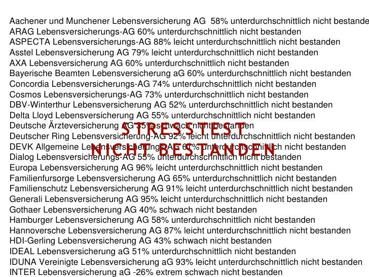 44. 46. Aachener und Münchener Lebensversicherung AG 58% unterdurchschnittlich nicht bestanden ARAG Lebensversicherungs-AG 60% unterdurchschnittlich nicht bestanden ASPECTA Lebensversicherungs-AG 88% leicht unterdurchschnittlich nicht bestanden Asstel Lebensversicherung AG 79% leicht unterdurchschnittlich nicht bestanden AXA Lebensversicherung AG 60% unterdurchschnittlich nicht bestanden Bayerische Beamten Lebensversicherung aG 60% unterdurchschnittlich nicht bestanden Concordia Lebensversicherungs-AG 74% unterdurchschnittlich nicht bestanden Cosmos Lebensversicherungs-AG 73% unterdurchschnittlich nicht bestanden DBV-Winterthur Lebensversicherung AG 52% unterdurchschnittlich nicht bestanden Delta Lloyd Lebensversicherung AG 55% unterdurchschnittlich nicht bestanden Deutsche Ärzteversicherung AG 35% schwach nicht bestanden Deutscher Ring Lebensversicherung-AG 92% leicht unterdurchschnittlich nicht bestanden DEVK Allgemeine Lebensversicherungs-AG 61% unterdurchschnittlich nicht bestanden Dialog Lebensversicherungs-AG 55% unterdurchschnittlich nicht bestanden Europa Lebensversicherung AG 96% leicht unterdurchschnittlich nicht bestanden Familienfürsorge Lebensversicherung AG 65% unterdurchschnittlich nicht bestanden Familienschutz Lebensversicherung AG 91% leicht unterdurchschnittlich nicht bestanden Generali Lebensversicherung AG 95% leicht unterdurchschnittlich nicht bestanden Gothaer Lebensversicherung AG 40% schwach nicht bestanden Hamburger Lebensversicherung AG 58% unterdurchschnittlich nicht bestanden Hannoversche Lebensversicherung AG 87% leicht unterdurchschnittlich nicht bestanden HDI-Gerling Lebensversicherung AG 43% schwach nicht bestanden IDEAL Lebensversicherung aG 51% unterdurchschnittlich nicht bestanden IDUNA Vereinigte Lebensversicherung aG 93% leicht unterdurchschnittlich nicht bestanden INTER Lebensversicherung aG -26% extrem schwach nicht bestanden InterRisk Lebensversicherung-AG 83% leicht unterdurchschnittlich nicht bestanden Karlsruher Lebensversicherung AG 83% leicht unterdurchschnittlich nicht bestanden Lebensversicherung von 1871 aG 97% leicht unterdurchschnittlich nicht bestanden LVM Lebensversicherungs-AG 99% leicht unterdurchschnittlich nicht bestanden Münchener Verein Lebensversicherung aG 40% schwach nicht bestanden Neue Bayerische Beamten Lebensversicherung AG 74% unterdurchschnittlich nicht bestanden neue leben Lebensversicherung AG 44% schwach nicht bestanden Nürnberger Lebensversicherung AG 97% leicht unterdurchschnittlich nicht bestanden oeco capital Lebensversicherung AG 52% unterdurchschnittlich nicht bestanden Öffentliche Lebensversicherung Berlin Brandenburg 25% schwach nicht bestanden Öffentliche Lebensversicherung Braunschweig 72% unterdurchschnittlich nicht bestanden Öffentliche Lebensversicherung Sachsen-Anhalt 92% leicht unterdurchschnittlich nicht bestanden ONTOS Lebensversicherung AG 49% schwach nicht bestanden PAX Schweizerische Lebensversicherungsgesellschaft AG 67% unterdurchschnittlich nicht bestanden PB Lebensversicherung AG 43% schwach nicht bestanden Plus Lebensversicherungs-AG 95% leicht unterdurchschnittlich nicht bestanden Protektor Lebensversicherungs-AG 47% schwach nicht bestanden Provinzial Lebensversicherung Hannover 82% leicht unterdurchschnittlich nicht bestanden Provinzial NordWest Lebensversicherung AG 74% unterdurchschnittlich nicht bestanden PRUDENTIA Lebensversicherungs-AG 43% schwach nicht bestanden Rheinland Lebensversicherung AG 65% unterdurchschnittlich nicht bestanden Saarland Lebensversicherung AG 76% leicht unterdurchschnittlich nicht bestanden Sparkassen-Versicherung Sachsen Lebensversicherung AG 43% schwach nicht bestanden Süddeutsche Lebensversicherung aG 46% schwach nicht bestanden SwissLife (Deutschland) 72% unterdurchschnittlich nicht bestanden uniVersa Lebensversicherung aG 37% schwach nicht bestanden Victoria Lebensversicherung AG 58% unterdurchschnittlich nicht bestanden VPV Lebensversicherungs-AG 9% sehr schwach nicht bestanden WGV-Schwäbische Lebensversicherung AG 72% unterdurchschnittlich nicht bestanden Württembergische Lebensversicherung AG 83% leicht unterdurchschnittlich nicht bestanden Zürich Deutscher Herold Lebensversicherung AG 34% schwach nicht bestanden STRESSTEST NICHT BESTANDEN