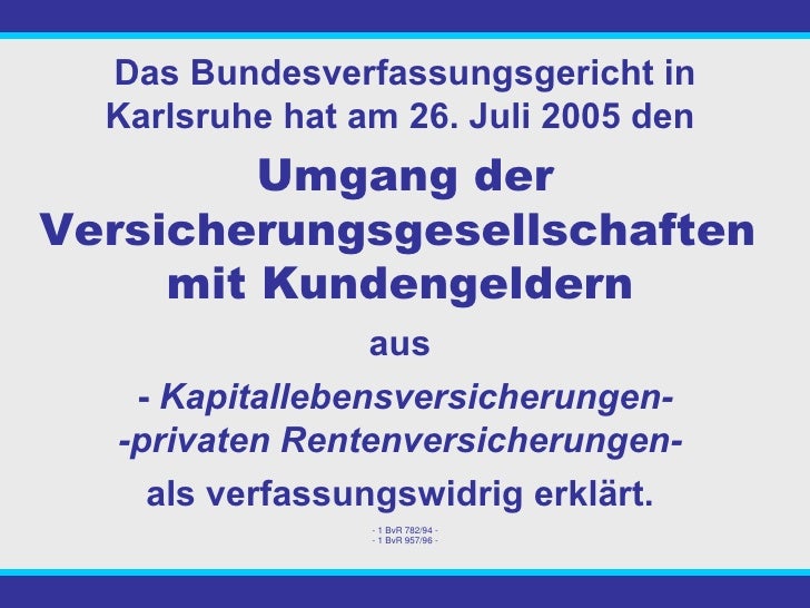 45. 48. Das Bundesverfassungsgericht in Karlsruhe hat am 26. Juli 2005 den Umgang der Versicherungsgesellschaften mit Kundengeldern aus - Kapitallebensversicherungen- -privaten Rentenversicherungen- als verfassungswidrig erklärt. - 1 BvR 782/94 - - 1 BvR 957/96 -
