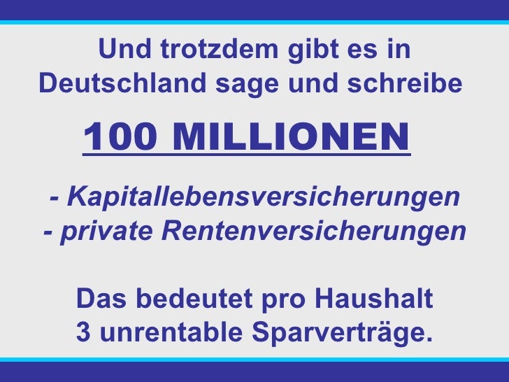 47. 50. Und trotzdem gibt es in Deutschland sage und schreibe 100 MILLIONEN - Kapitallebensversicherungen - private Rentenversicherungen Das bedeutet pro Haushalt 3 unrentable Sparverträge.