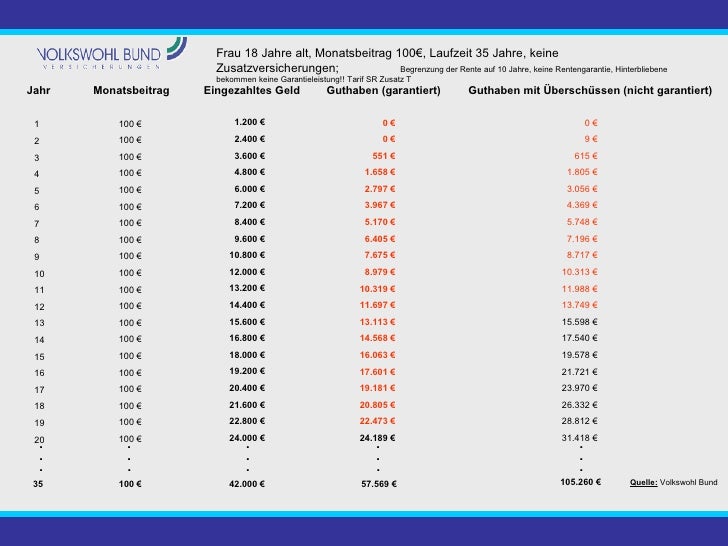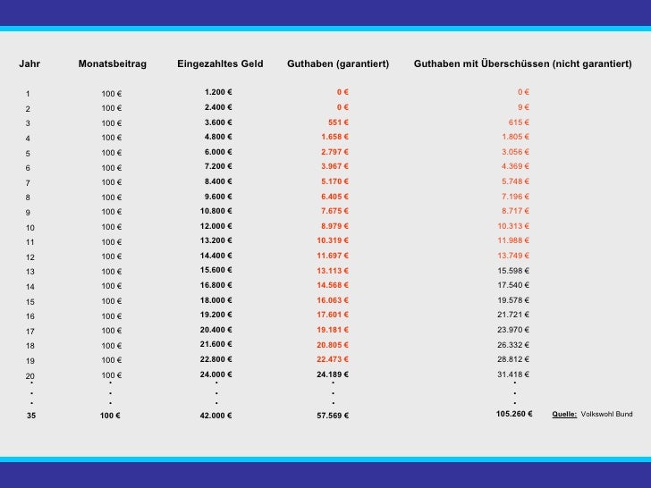 56. 59. Jahr Guthaben (garantiert) Eingezahltes Geld Monatsbeitrag Guthaben mit Überschüssen (nicht garantiert) 1 2 3 4 5 6 7 8 9 10 11 12 13 14 15 16 17 18 19 20 100 € 100 € 100 € 100 € 100 € 100 € 100 € 100 € 100 € 100 € 100 € 100 € 100 € 100 € 100 € 100 € 100 € 100 € 100 € 100 € 1.200 € 2.400 € 3.600 € 4.800 € 6.000 € 7.200 € 8.400 € 9.600 € 10.800 € 12.000 € 13.200 € 14.400 € 15.600 € 16.800 € 18.000 € 19.200 € 20.400 € 21.600 € 22.800 € 24.000 € 35 100 € 42.000 € 57.569 € 105.260 € . . . . . . . . . . . . . . . 0 € 0 € 551 € 1.658 € 2.797 € 3.967 € 5.170 € 6.405 € 7.675 € 8.979 € 10.319 € 11.697 € 13.113 € 14.568 € 16.063 € 17.601 € 19.181 € 20.805 € 22.473 € 24.189 € 0 € 9 € 615 € 1.805 € 3.056 € 4.369 € 5.748 € 7.196 € 8.717 € 10.313 € 11.988 € 13.749 € 15.598 € 17.540 € 19.578 € 21.721 € 23.970 € 26.332 € 28.812 € 31.418 € Quelle: Volkswohl Bund