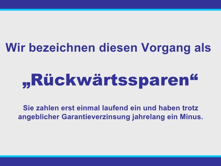 57. 60. Wir bezeichnen diesen Vorgang als „ Rückwärtssparen“ Sie zahlen erst einmal laufend ein und haben trotz angeblicher Garantieverzinsung jahrelang ein Minus.