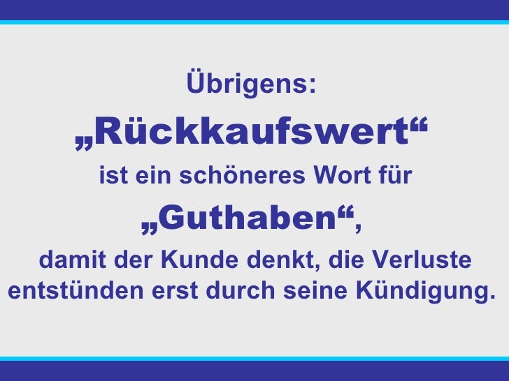 60. 63. Übrigens: „ Rückkaufswert“ ist ein schöneres Wort für „ Guthaben“ , damit der Kunde denkt, die Verluste entstünden erst durch seine Kündigung.