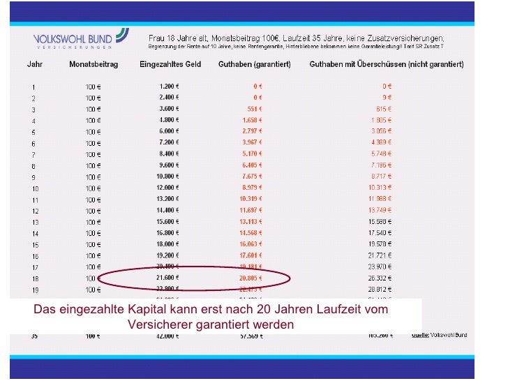 5. 6. Jahr Guthaben (garantiert) Eingezahltes Geld Monatsbeitrag Guthaben mit Überschüssen (nicht garantiert) 1 2 3 4 5 6 7 8 9 10 11 12 13 14 15 16 17 18 19 20 100 € 100 € 100 € 100 € 100 € 100 € 100 € 100 € 100 € 100 € 100 € 100 € 100 € 100 € 100 € 100 € 100 € 100 € 100 € 100 € 1.200 € 2.400 € 3.600 € 4.800 € 6.000 € 7.200 € 8.400 € 9.600 € 10.800 € 12.000 € 13.200 € 14.400 € 15.600 € 16.800 € 18.000 € 19.200 € 20.400 € 21.600 € 22.800 € 24.000 € 35 100 € 42.000 € 57.569 € 105.260 € Frau 18 Jahre alt, Monatsbeitrag 100€, Laufzeit 35 Jahre, keine Zusatzversicherungen; Begrenzung der Rente auf 10 Jahre, keine Rentengarantie, Hinterbliebene bekommen keine Garantieleistung!! Tarif SR Zusatz T . . . . . . . . . . . . . . . 0 € 0 € 551 € 1.658 € 2.797 € 3.967 € 5.170 € 6.405 € 7.675 € 8.979 € 10.319 € 11.697 € 13.113 € 14.568 € 16.063 € 17.601 € 19.181 € 20.805 € 22.473 € 24.189 € 0 € 9 € 615 € 1.805 € 3.056 € 4.369 € 5.748 € 7.196 € 8.717 € 10.313 € 11.988 € 13.749 € 15.598 € 17.540 € 19.578 € 21.721 € 23.970 € 26.332 € 28.812 € 31.418 € Quelle: Volkswohl Bund