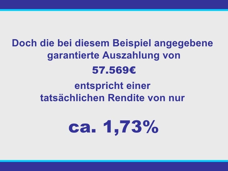 8. 9. Doch die bei diesem Beispiel angegebene garantierte Auszahlung von 57.569€ entspricht einer tatsächlichen Rendite von nur ca. 1,73%