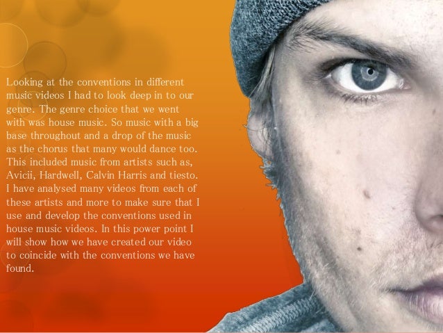2. 2. Looking at the conventions in different music videos I had to look deep in to our genre. The genre choice that we went with was house music. So music with a big base throughout and a drop of the music as the chorus that many would dance too. This included music from artists such as, Avicii, Hardwell, Calvin Harris and tiesto. I have analysed many videos from each of these artists and more to make sure that I use and develop the conventions used in house music videos. In this power point I will show how we have created our video to coincide with the conventions we have found.
