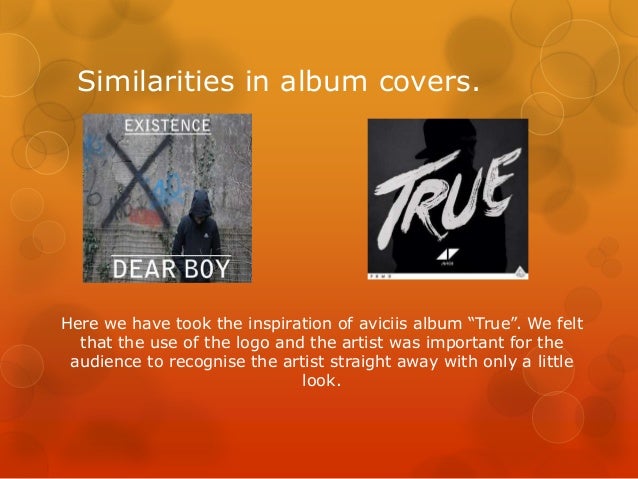 3. 3. Similarities in album covers. Here we have took the inspiration of aviciis album “True”. We felt that the use of the logo and the artist was important for the audience to recognise the artist straight away with only a little look.