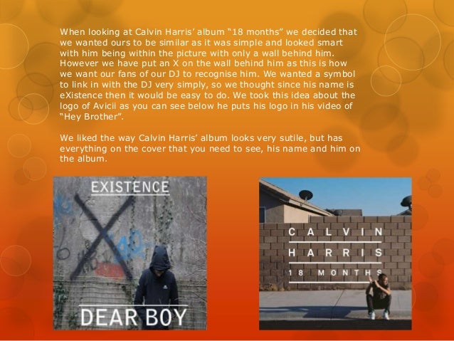 4. 4. When looking at Calvin Harris’ album “18 months” we decided that we wanted ours to be similar as it was simple and looked smart with him being within the picture with only a wall behind him. However we have put an X on the wall behind him as this is how we want our fans of our DJ to recognise him. We wanted a symbol to link in with the DJ very simply, so we thought since his name is eXistence then it would be easy to do. We took this idea about the logo of Avicii as you can see below he puts his logo in his video of “Hey Brother”. We liked the way Calvin Harris’ album looks very sutile, but has everything on the cover that you need to see, his name and him on the album.