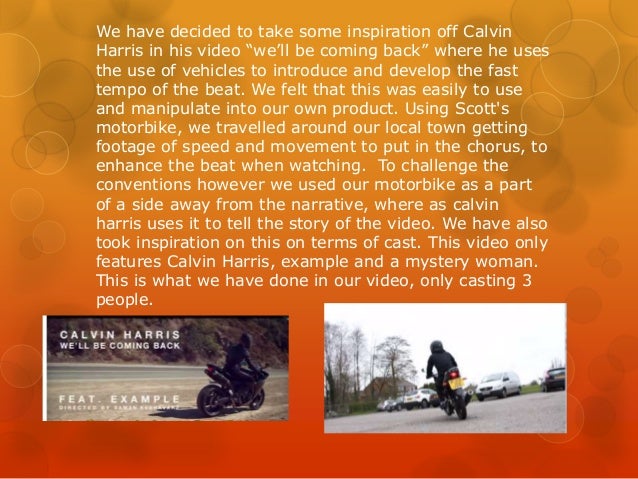 5. 5. We have decided to take some inspiration off Calvin Harris in his video “we’ll be coming back” where he uses the use of vehicles to introduce and develop the fast tempo of the beat. We felt that this was easily to use and manipulate into our own product. Using Scott's motorbike, we travelled around our local town getting footage of speed and movement to put in the chorus, to enhance the beat when watching. To challenge the conventions however we used our motorbike as a part of a side away from the narrative, where as calvin harris uses it to tell the story of the video. We have also took inspiration on this on terms of cast. This video only features Calvin Harris, example and a mystery woman. This is what we have done in our video, only casting 3 people.