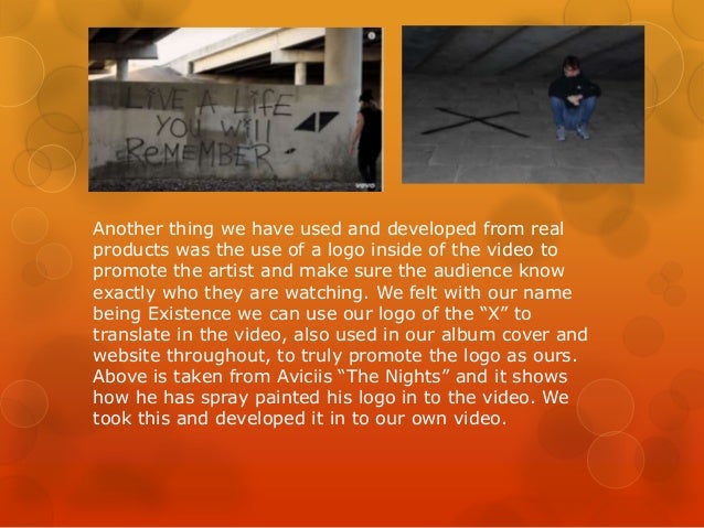 6. 6. Another thing we have used and developed from real products was the use of a logo inside of the video to promote the artist and make sure the audience know exactly who they are watching. We felt with our name being Existence we can use our logo of the “X” to translate in the video, also used in our album cover and website throughout, to truly promote the logo as ours. Above is taken from Aviciis “The Nights” and it shows how he has spray painted his logo in to the video. We took this and developed it in to our own video.