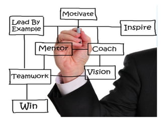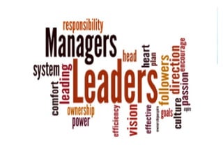 The document discusses leadership behavior, emphasizing that leadership involves influencing others to achieve goals. It contrasts leadership with management and outlines core leadership behaviors, highlighting the importance of client satisfaction, staff commitment, and strategic management. Additionally, it mentions the factors of strengths, weaknesses, opportunities, and threats (SWOT) in leadership development.
