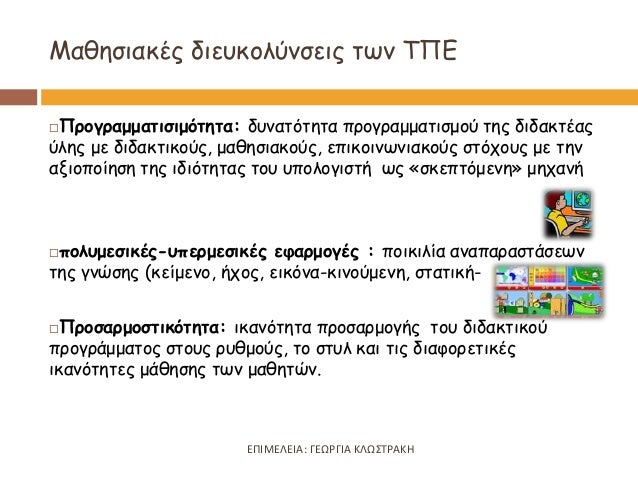 101. 101. Μαζεζηαθέξ δηεοθμιφκζεηξ ηςκ ΣΠΓΠνμγναμμαηηζημόηεηα: δοκαηυηεηα πνμγναμμαηηζμμφ ηεξ δηδαθηέαξφιεξ με δηδαθηηθμφξ, μαζεζηαθμφξ, επηθμηκςκηαθμφξ ζηυπμοξ με ηεκαλημπμίεζε ηεξ ηδηυηεηαξ ημο οπμιμγηζηή ςξ «ζθεπηυμεκε» μεπακήπμιομεζηθέξ-οπενμεζηθέξ εθανμμγέξ : πμηθηιία ακαπαναζηάζεςκηεξ γκχζεξ (θείμεκμ, ήπμξ, εηθυκα-θηκμφμεκε, ζηαηηθή-Πνμζανμμζηηθόηεηα: ηθακυηεηα πνμζανμμγήξ ημο δηδαθηηθμφπνμγνάμμαημξ ζημοξ νοζμμφξ, ημ ζηοι θαη ηηξ δηαθμνεηηθέξηθακυηεηεξ μάζεζεξ ηςκ μαζεηχκ.ΕΠΙΜΕΛΕΙΑ: ΓΕΩΡΓΙΑ ΚΛΩ΢ΣΡΑΚΗ