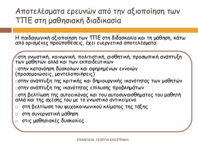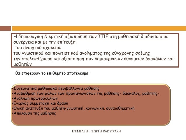 95. 95. ζα επηθένμοκ ημ επηζομεηυ απμηέιεζμα:•΢οκενγαηηθά μαζεζηαθά πενηβάιιμκηα μάζεζεξ•Ακαβάζμηζε ηςκ νυιςκ ηςκ πνςηαγςκηζηχκ ηεξ μάζεζεξ- δάζθαιμξ, μαζεηήξ-•Ακάιερε πνςημβμοιηχκ•Γκενγυξ ζομμεημπή θαη δνάζε•Οιηθή ακάπηολε ημο μαζεηή-γκςζηηθή, θμηκςκηθή, ζοκαηζζεμαηηθή•Απυιαοζε ηεξ μάζεζεξΗ δεμημονγηθή & θνηηηθή αλημπμίεζε ηςκ ΣΠΓ ζηε μαζεζηαθή δηαδηθαζία ζεζοκένγεηα θαη με ηεκ επίηεολε:ημο ακμηπημφ ζπμιείμοημο γκςζηηθμφ θαη πμιηηηζηηθμφ ακμίγμαημξ ηεξ ζφγπνμκεξ ζθέρεξηεκ απειεοζένςζε θαη αλημπμίεζε ηςκ δεμημονγηθχκ δοκάμεςκ δαζθάιςκ θαημαζεηχκΕΠΙΜΕΛΕΙΑ: ΓΕΩΡΓΙΑ ΚΛΩ΢ΣΡΑΚΗ