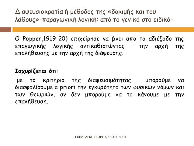 11. 11. Δηαρεοζημθναηία ή μέζμδμξ ηεξ «δμθημήξ θαη ημοιάζμοξ»-παναγςγηθή ιμγηθή: απυ ημ γεκηθυ ζημ εηδηθυ-Ο Popper,1919-20) επηπείνεζε κα βγεη απυ ημ αδηέλμδμ ηεξεπαγςγηθήξ ιμγηθήξ ακηηθαζηζηχκηαξ ηεκ ανπή ηεξεπαιήζεοζεξ με ηεκ ανπή ηεξ δηάρεοζεξ.Ιζπονίδεηαη όηη:με ημ θνηηήνημ ηεξ δηαρεοζημυηεηαξ μπμνμφμε καδηαζθαιίζμομε a priori ηεκ εγθονυηεηα ηςκ θοζηθχκ κυμςκ θαηηςκ ζεςνηχκ, ακ δεκ μπμνμφμε κα ημ θάκμομε με ηεκεπαιήζεοζε.ΕΠΙΜΕΛΕΙΑ: ΓΕΩΡΓΙΑ ΚΛΩ΢ΣΡΑΚΗ