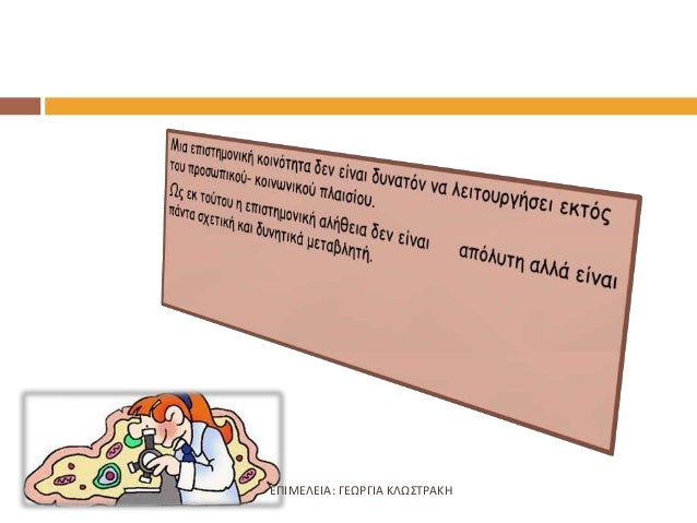 12. 12. Οη επηζηήμμκεξ:Θέημοκ θάπμηα οπμζεηηθά ζομπενάζμαηα θαη ηα οπμβάιιμοκ ζε εμπεηνηθέξδμθημαζίεξΟ επηζηήμμκαξ δειαδή πνμζπαζεί κα δηαρεφζεη ηηξ ζεςνεηηθέξ θαηαζθεοέξθαη υπη κα ηηξ επαιεζεφζεη. Η μεζμδμιμγηθή πνμζέγγηζε ημο Popperαπμβιέπεη ζηεκ θνηηηθή-μνζμιμγηζηηθή ακηημεηχπηζε ηςκ ζεςνεηηθχκοπμζέζεςκ (Γθίβαιμξ, 2005 ).Όζμ πημ αθνηβήξ θαη ζαθήξ είκαη ε δηαηφπςζή ηεξ επηζηεμμκηθήξ ζεςνίαξηυζμ πενηζζυηενμ ηεκ θαζηζηά δηαρεφζημε (Chalmers , 2004).ΕΠΙΜΕΛΕΙΑ: ΓΕΩΡΓΙΑ ΚΛΩ΢ΣΡΑΚΗ