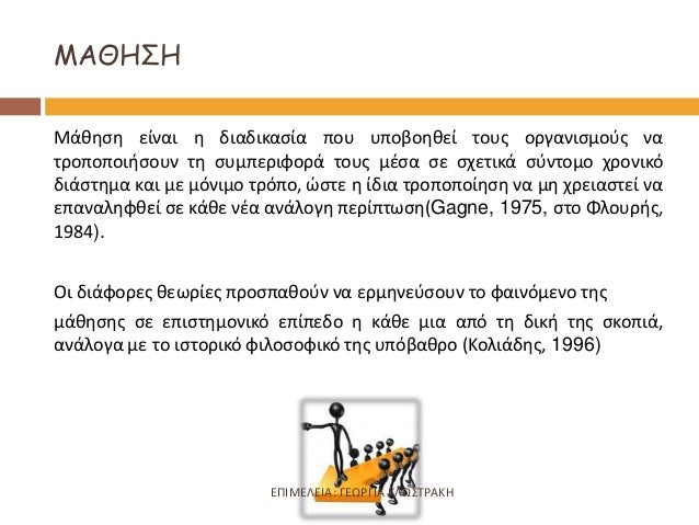 19. 19. ΜΑΘΗ΢ΗΜάκθςθ είναι θ διαδικαςία που υποβοθκεί τουσ οργανιςμοφσ νατροποποιιςουν τθ ςυμπεριφορά τουσ μζςα ςε ςχετικά ςφντομο χρονικόδιάςτθμα και με μόνιμο τρόπο, ϊςτε θ ίδια τροποποίθςθ να μθ χρειαςτεί ναεπαναλθφκεί ςε κάκε νζα ανάλογθ περίπτωςθ(Gagne, 1975, ςτο Φλουρισ,1984).Οι διάφορεσ κεωρίεσ προςπακοφν να ερμθνεφςουν το φαινόμενο τθσμάκθςθσ ςε επιςτθμονικό επίπεδο θ κάκε μια από τθ δικι τθσ ςκοπιά,ανάλογα με το ιςτορικό φιλοςοφικό τθσ υπόβακρο (Κολιάδθσ, 1996)ΕΠΙΜΕΛΕΙΑ: ΓΕΩΡΓΙΑ ΚΛΩ΢ΣΡΑΚΗ
