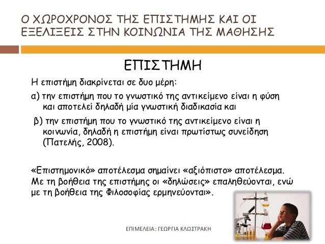 2. 2. Ο ΥΩΡΟΥΡΟΝΟ΢ ΣΗ΢ ΓΠΙ΢ΣΗΜΗ΢ ΚΑΙ ΟΙΓΞΓΛΙΞΓΙ΢ ΢ΣΗΝ ΚΟΙΝΩΝΙΑ ΣΗ΢ ΜΑΘΗ΢Η΢ΓΠΙ΢ΣΗΜΗΗ επηζηήμε δηαθνίκεηαη ζε δομ μένε:α) ηεκ επηζηήμε πμο ημ γκςζηηθυ ηεξ ακηηθείμεκμ είκαη ε θφζεθαη απμηειεί δειαδή μία γκςζηηθή δηαδηθαζία θαηβ) ηεκ επηζηήμε πμο ημ γκςζηηθυ ηεξ ακηηθείμεκμ είκαη εθμηκςκία, δειαδή ε επηζηήμε είκαη πνςηίζηςξ ζοκείδεζε(Παηειήξ, 2008).«Γπηζηεμμκηθυ» απμηέιεζμα ζεμαίκεη «αληυπηζημ» απμηέιεζμα.Με ηε βμήζεηα ηεξ επηζηήμεξ μη «δειχζεηξ» επαιεζεφμκηαη, εκχμε ηε βμήζεηα ηεξ Φηιμζμθίαξ ενμεκεφμκηαη».ΕΠΙΜΕΛΕΙΑ: ΓΕΩΡΓΙΑ ΚΛΩ΢ΣΡΑΚΗ