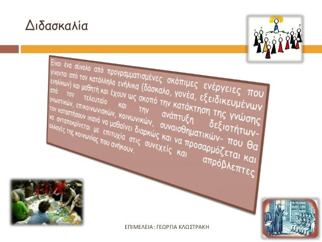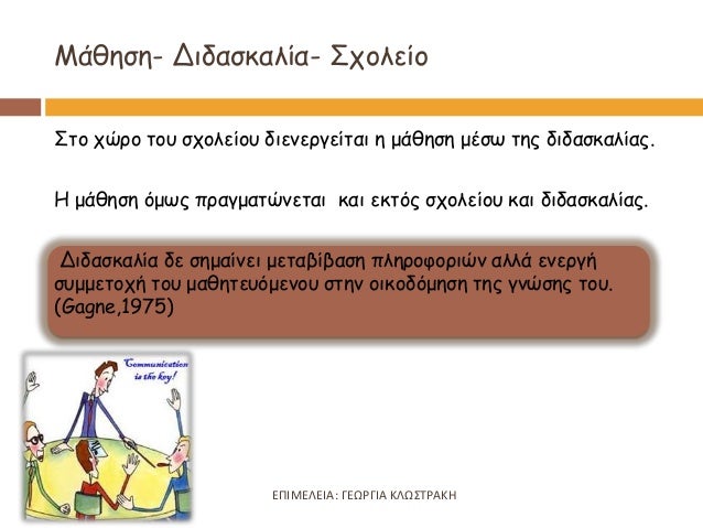21. 21. Μάζεζε- Δηδαζθαιία- ΢πμιείμ΢ημ πχνμ ημο ζπμιείμο δηεκενγείηαη ε μάζεζε μέζς ηεξ δηδαζθαιίαξ.Η μάζεζε υμςξ πναγμαηχκεηαη θαη εθηυξ ζπμιείμο θαη δηδαζθαιίαξ.Δηδαζθαιία δε ζεμαίκεη μεηαβίβαζε πιενμθμνηχκ αιιά εκενγήζομμεημπή ημο μαζεηεουμεκμο ζηεκ μηθμδυμεζε ηεξ γκχζεξ ημο.(Gagne,1975)ΕΠΙΜΕΛΕΙΑ: ΓΕΩΡΓΙΑ ΚΛΩ΢ΣΡΑΚΗ