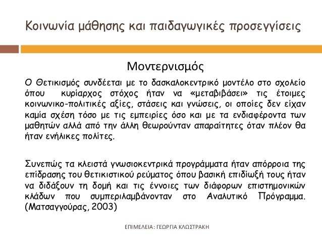 22. 22. Κμηκςκία μάζεζεξ θαη παηδαγςγηθέξ πνμζεγγίζεηξΜοντερνιςμόσΟ Θεηηθηζμυξ ζοκδέεηαη με ημ δαζθαιμθεκηνηθυ μμκηέιμ ζημ ζπμιείμυπμο θονίανπμξ ζηυπμξ ήηακ κα «μεηαβηβάζεη» ηηξ έημημεξθμηκςκηθμ-πμιηηηθέξ αλίεξ, ζηάζεηξ θαη γκχζεηξ, μη μπμίεξ δεκ είπακθαμία ζπέζε ηυζμ με ηηξ εμπεηνίεξ υζμ θαη με ηα εκδηαθένμκηα ηςκμαζεηχκ αιιά απυ ηεκ άιιε ζεςνμφκηακ απαναίηεηεξ υηακ πιέμκ ζαήηακ εκήιηθεξ πμιίηεξ.΢οκεπχξ ηα θιεηζηά γκςζημθεκηνηθά πνμγνάμμαηα ήηακ απυννμηα ηεξεπίδναζεξ ημο ζεηηθηζηηθμφ νεφμαημξ υπμο βαζηθή επηδίςλή ημοξ ήηακκα δηδάλμοκ ηε δμμή θαη ηηξ έκκμηεξ ηςκ δηάθμνςκ επηζηεμμκηθχκθιάδςκ πμο ζομπενηιαμβάκμκηακ ζημ Ακαιοηηθυ Πνυγναμμα.(Μαηζαγγμφναξ, 2003)ΕΠΙΜΕΛΕΙΑ: ΓΕΩΡΓΙΑ ΚΛΩ΢ΣΡΑΚΗ