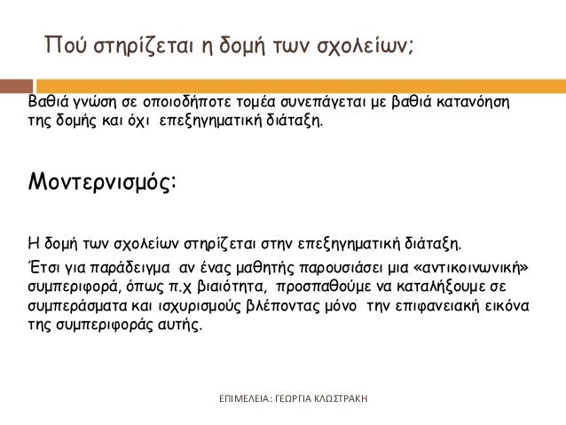 24. 24. «ειάπηζηα πνάγμαηα είκαη υπςξ θαίκμκηαη ζηεκ επηθάκεηα».Έηζη, ζφμθςκα με ηεκ θνηηηθή μεηαμμκηένκα ζεςνία, ακαδεημφμε θαηζηε μηθνμθμηκςκία ημο ζπμιείμο ηηξ βαζφηενεξ θαηαζηάζεηξ πμομδήγεζακ ζε αοηήκ ηεκ «ακηηθμηκςκηθή» ζομπενηθμνά.Οη μειεηεηέξ μέζα απυ μηα δηαδηθαζία ένεοκαξ ηςκ βαζηχκ δμμχκ πμοοπάνπμοκ γηα κα απμθαιοθζμφκ ζε μπμηαδήπμηε ζπμιηθή ηάλε,ακαθαιφπημοκ «έκα ζφμπακ θνοθχκ κμεμάηςκ πμο θαηαζθεοάδεηαηαπυ μηα πμηθηιία θμηκςκηθμπμιηηηθχκ δοκάμεςκ, ημ μπμίμ πμιιέξθμνέξ έπεη ειάπηζηε ζπέζε με ηηξ πνμβιεπυμεκεξ ζεμαζίεξ-ελεγήζεηξ- ημο επίζεμμο ακαιοηηθμφ πνμγνάμμαημξ ζπμοδχκ».Η θνηηηθή μεηαμμκηένκα ζεςνία οπμζηενίδεη υηη:ΕΠΙΜΕΛΕΙΑ: ΓΕΩΡΓΙΑ ΚΛΩ΢ΣΡΑΚΗ