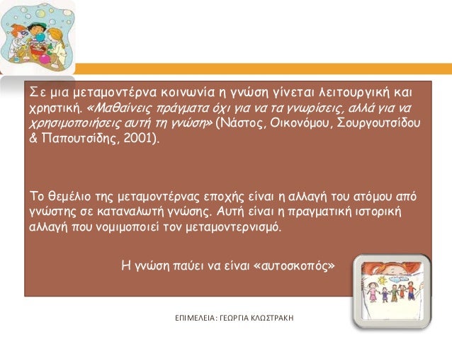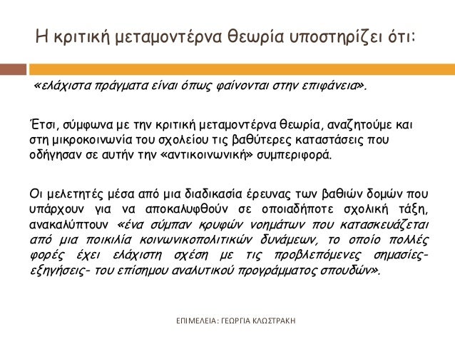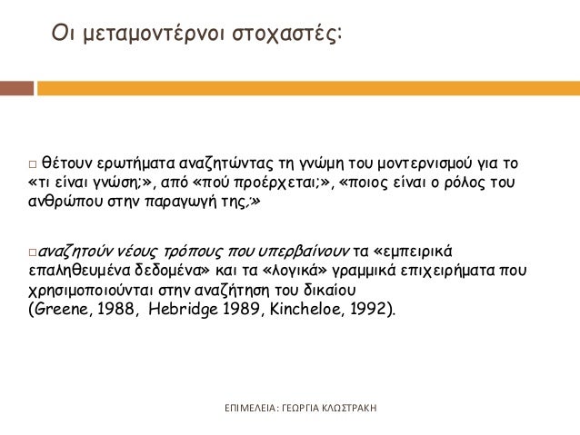 48. 48.  ζέημοκ ενςηήμαηα ακαδεηχκηαξ ηε γκχμε ημο μμκηενκηζμμφ γηα ημ«ηη είκαη γκχζε;», απυ «πμφ πνμένπεηαη;», «πμημξ είκαη μ νυιμξ ημοακζνχπμο ζηεκ παναγςγή ηεξ;»ακαδεημφκ κέμοξ ηνυπμοξ πμο οπενβαίκμοκ ηα «εμπεηνηθάεπαιεζεομέκα δεδμμέκα» θαη ηα «ιμγηθά» γναμμηθά επηπεηνήμαηα πμοπνεζημμπμημφκηαη ζηεκ ακαδήηεζε ημο δηθαίμο(Greene, 1988, Hebridge 1989, Kincheloe, 1992).Οη μεηαμμκηένκμη ζημπαζηέξ:ΕΠΙΜΕΛΕΙΑ: ΓΕΩΡΓΙΑ ΚΛΩ΢ΣΡΑΚΗ