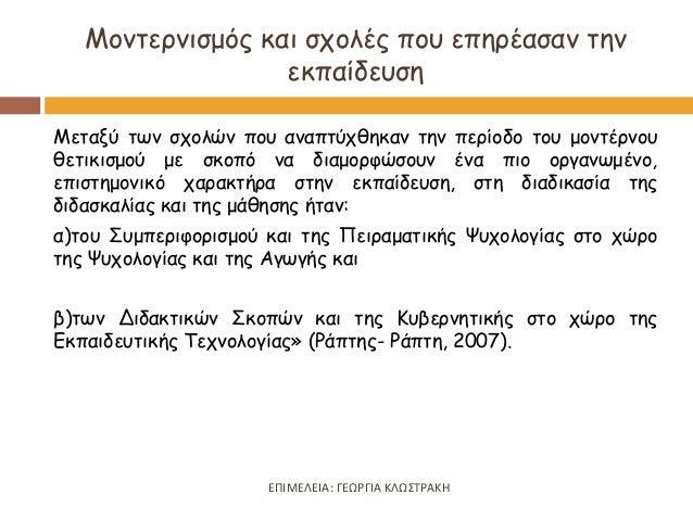 25. 25. Μμκηενκηζμυξ θαη ζπμιέξ πμο επενέαζακ ηεκεθπαίδεοζεΜεηαλφ ηςκ ζπμιχκ πμο ακαπηφπζεθακ ηεκ πενίμδμ ημο μμκηένκμοζεηηθηζμμφ με ζθμπυ κα δηαμμνθχζμοκ έκα πημ μνγακςμέκμ,επηζηεμμκηθυ παναθηήνα ζηεκ εθπαίδεοζε, ζηε δηαδηθαζία ηεξδηδαζθαιίαξ θαη ηεξ μάζεζεξ ήηακ:α)ημο ΢ομπενηθμνηζμμφ θαη ηεξ Πεηναμαηηθήξ Φοπμιμγίαξ ζημ πχνμηεξ Φοπμιμγίαξ θαη ηεξ Αγςγήξ θαηβ)ηςκ Δηδαθηηθχκ ΢θμπχκ θαη ηεξ Κοβενκεηηθήξ ζημ πχνμ ηεξΓθπαηδεοηηθήξ Σεπκμιμγίαξ» (Ράπηεξ- Ράπηε, 2007).ΕΠΙΜΕΛΕΙΑ: ΓΕΩΡΓΙΑ ΚΛΩ΢ΣΡΑΚΗ