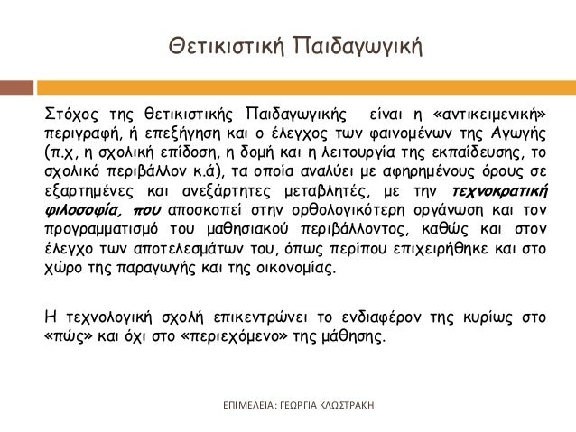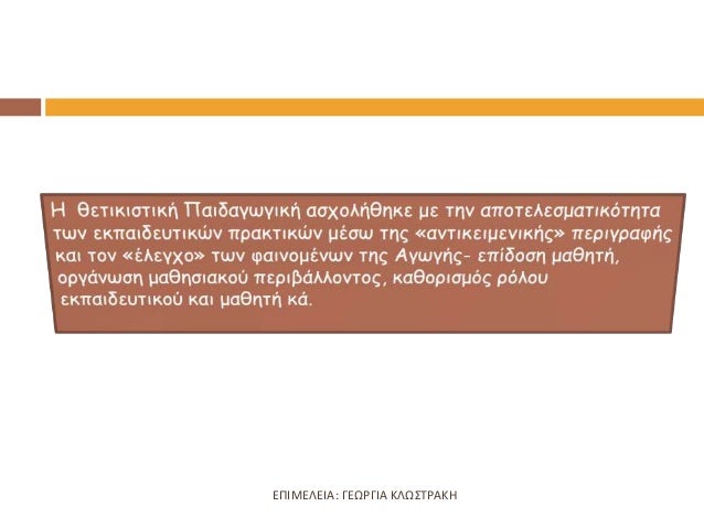32. 32. Θεηηθηζηηθή Παηδαγςγηθή΢ηυπμξ ηεξ ζεηηθηζηηθήξ Παηδαγςγηθήξ είκαη ε «ακηηθεημεκηθή»πενηγναθή, ή επελήγεζε θαη μ έιεγπμξ ηςκ θαηκμμέκςκ ηεξ Αγςγήξ(π.π, ε ζπμιηθή επίδμζε, ε δμμή θαη ε ιεηημονγία ηεξ εθπαίδεοζεξ, ημζπμιηθυ πενηβάιιμκ θ.ά), ηα μπμία ακαιφεη με αθενεμέκμοξ υνμοξ ζεελανηεμέκεξ θαη ακελάνηεηεξ μεηαβιεηέξ, με ηεκ ηεπκμθναηηθήθηιμζμθία, πμο απμζθμπεί ζηεκ μνζμιμγηθυηενε μνγάκςζε θαη ημκπνμγναμμαηηζμυ ημο μαζεζηαθμφ πενηβάιιμκημξ, θαζχξ θαη ζημκέιεγπμ ηςκ απμηειεζμάηςκ ημο, υπςξ πενίπμο επηπεηνήζεθε θαη ζημπχνμ ηεξ παναγςγήξ θαη ηεξ μηθμκμμίαξ.Η ηεπκμιμγηθή ζπμιή επηθεκηνχκεη ημ εκδηαθένμκ ηεξ θονίςξ ζημ«πχξ» θαη υπη ζημ «πενηεπυμεκμ» ηεξ μάζεζεξ.ΕΠΙΜΕΛΕΙΑ: ΓΕΩΡΓΙΑ ΚΛΩ΢ΣΡΑΚΗ