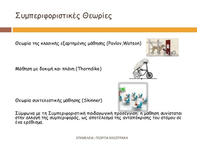 28. 28. Γλανηεμέκε Μάζεζε (Pavlov,Watson)Η βαζηθή ηδέα ημο μαζεζηαθμφ αοημφ πνμηφπμο οπμθνφπηεηαη ζηεκοπυζεζε υηη ε μάζεζε δεκ απμηειεί ηίπμηε άιιμ πανά ζφκδεζε μίαξμνηζμέκεξ ζομπενηθμνάξ (ακηίδναζεξ) με έκα πενηζηαζηαθυ δεδμμέκμ(ενέζηζμα).Τπμζηενίδεη υηη μ ηνυπμξ μέ ημκ μπμίμ μαζαίκμομε έπεη κα θάκεη μεηηξ ζοκελανηήζεηξ θοζηθχκ θαη μοδέηενςκ ενεζηζμάηςκ. Π.π. Σμ καζοκελανηήζεη έκαξ μαζεηήξ ημ ζπμιείμ με εοπάνηζηεξ θαηαζηάζεηξ(θοζηθυ ενέζηζμα). Σμ μάζεμα αοηυ θαζ αοηυ (ημ γκςζηηθυ δειαδήακηηθείμεκμ) είκαη έκα μοδέηενμ ενέζηζμα. Ο δάζθαιμξ, πανά ηηξζοκαηζζεμαηηθέξ ημο ελάνζεηξ είκαη θοζηθυ ενέζηζμα.ΕΠΙΜΕΛΕΙΑ: ΓΕΩΡΓΙΑ ΚΛΩ΢ΣΡΑΚΗ