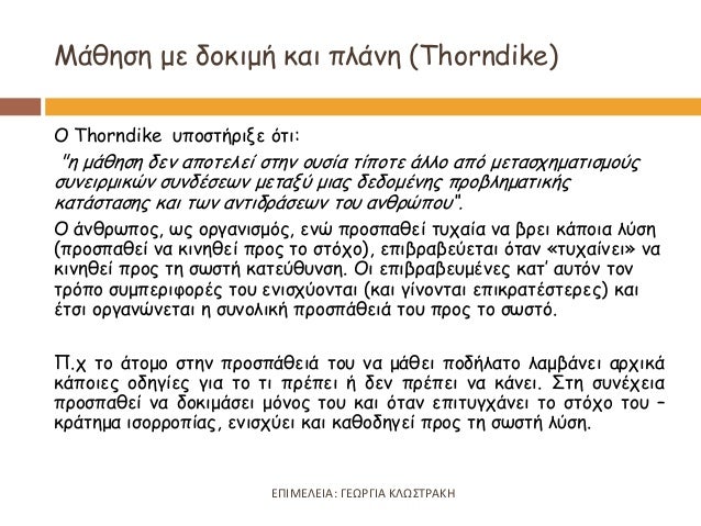 29. 29. Μάζεζε με δμθημή θαη πιάκε (Thorndike)O Thorndike οπμζηήνηλε υηη:"ε μάζεζε δεκ απμηειεί ζηεκ μοζία ηίπμηε άιιμ απυ μεηαζπεμαηηζμμφξζοκεηνμηθχκ ζοκδέζεςκ μεηαλφ μηαξ δεδμμέκεξ πνμβιεμαηηθήξθαηάζηαζεξ θαη ηςκ ακηηδνάζεςκ ημο ακζνχπμο“.Ο άκζνςπμξ, ςξ μνγακηζμυξ, εκχ πνμζπαζεί ηοπαία κα βνεη θάπμηα ιφζε(πνμζπαζεί κα θηκεζεί πνμξ ημ ζηυπμ), επηβναβεφεηαη υηακ «ηοπαίκεη» καθηκεζεί πνμξ ηε ζςζηή θαηεφζοκζε. Οη επηβναβεομέκεξ θαη’ αοηυκ ημκηνυπμ ζομπενηθμνέξ ημο εκηζπφμκηαη (θαη γίκμκηαη επηθναηέζηενεξ) θαηέηζη μνγακχκεηαη ε ζοκμιηθή πνμζπάζεηά ημο πνμξ ημ ζςζηυ.Π.π ημ άημμμ ζηεκ πνμζπάζεηά ημο κα μάζεη πμδήιαημ ιαμβάκεη ανπηθάθάπμηεξ μδεγίεξ γηα ημ ηη πνέπεη ή δεκ πνέπεη κα θάκεη. ΢ηε ζοκέπεηαπνμζπαζεί κα δμθημάζεη μυκμξ ημο θαη υηακ επηηογπάκεη ημ ζηυπμ ημο –θνάηεμα ηζμννμπίαξ, εκηζπφεη θαη θαζμδεγεί πνμξ ηε ζςζηή ιφζε.ΕΠΙΜΕΛΕΙΑ: ΓΕΩΡΓΙΑ ΚΛΩ΢ΣΡΑΚΗ