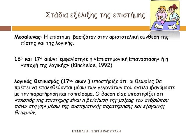 3. 3. ΢ηάδηα ελέιηλεξ ηεξ επηζηήμεξΜεζαίωκαξ: Η επηζηήμε βαζηδυηακ ζηεκ ανηζημηειηθή ζφκζεζε ηεξπίζηεξ θαη ηεξ ιμγηθήξ.16μ θαη 17μ αηώκ: εμθακίζηεθε ε «Γπηζηεμμκηθή Γπακάζηαζε» ή ε«επμπή ηεξ ιμγηθήξ» (Kincheloe, 1992).ιμγηθόξ ζεηηθηζμόξ (17μξ αηωκ.) οπμζηήνηλε υηη: μη ζεςνίεξ ζαπνέπεη κα επαιεζεφμκηαη μέζς ηςκ γεγμκυηςκ πμο ακηηιαμβακυμαζηεμε ηεκ παναηήνεζε θαη ημ πείναμα. Ο Bacon είπε οπμζηενίλεη υηη«ζθμπυξ ηεξ επηζηήμεξ είκαη ε βειηίςζε ηεξ μμίναξ ημο ακζνχπμοπάκς ζηε γε» μέζς ηεξ ζοζηεμαηηθήξ παναηήνεζεξ θαη ελαγςγήξζεςνηχκ.ΕΠΙΜΕΛΕΙΑ: ΓΕΩΡΓΙΑ ΚΛΩ΢ΣΡΑΚΗ