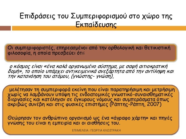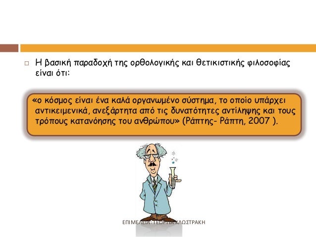 4. 4.  Η βαζηθή παναδμπή ηεξ μνζμιμγηθήξ θαη ζεηηθηζηηθήξ θηιμζμθίαξείκαη υηη:«μ θυζμμξ είκαη έκα θαιά μνγακςμέκμ ζφζηεμα, ημ μπμίμ οπάνπεηακηηθεημεκηθά, ακελάνηεηα απυ ηηξ δοκαηυηεηεξ ακηίιερεξ θαη ημοξηνυπμοξ θαηακυεζεξ ημο ακζνχπμο» (Ράπηεξ- Ράπηε, 2007 ).ΕΠΙΜΕΛΕΙΑ: ΓΕΩΡΓΙΑ ΚΛΩ΢ΣΡΑΚΗ