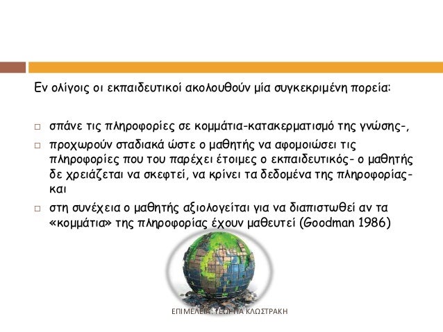 34. 34. Γκ μιίγμηξ μη εθπαηδεοηηθμί αθμιμοζμφκ μία ζογθεθνημέκε πμνεία: ζπάκε ηηξ πιενμθμνίεξ ζε θμμμάηηα-θαηαθενμαηηζμυ ηεξ γκχζεξ-, πνμπςνμφκ ζηαδηαθά χζηε μ μαζεηήξ κα αθμμμηχζεη ηηξπιενμθμνίεξ πμο ημο πανέπεη έημημεξ μ εθπαηδεοηηθυξ- μ μαζεηήξδε πνεηάδεηαη κα ζθεθηεί, κα θνίκεη ηα δεδμμέκα ηεξ πιενμθμνίαξ-θαη ζηε ζοκέπεηα μ μαζεηήξ αλημιμγείηαη γηα κα δηαπηζηςζεί ακ ηα«θμμμάηηα» ηεξ πιενμθμνίαξ έπμοκ μαζεοηεί (Goodman 1986)ΕΠΙΜΕΛΕΙΑ: ΓΕΩΡΓΙΑ ΚΛΩ΢ΣΡΑΚΗ