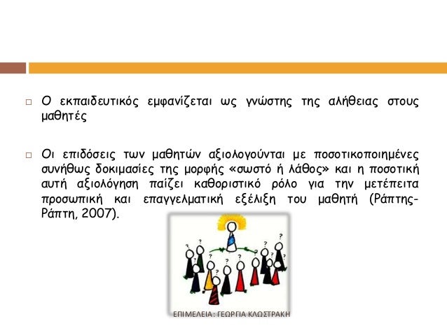 35. 35.  Ο εθπαηδεοηηθυξ εμθακίδεηαη ςξ γκχζηεξ ηεξ αιήζεηαξ ζημοξμαζεηέξ Οη επηδυζεηξ ηςκ μαζεηχκ αλημιμγμφκηαη με πμζμηηθμπμηεμέκεξζοκήζςξ δμθημαζίεξ ηεξ μμνθήξ «ζςζηυ ή ιάζμξ» θαη ε πμζμηηθήαοηή αλημιυγεζε παίδεη θαζμνηζηηθυ νυιμ γηα ηεκ μεηέπεηηαπνμζςπηθή θαη επαγγειμαηηθή ελέιηλε ημο μαζεηή (Ράπηεξ-Ράπηε, 2007).ΕΠΙΜΕΛΕΙΑ: ΓΕΩΡΓΙΑ ΚΛΩ΢ΣΡΑΚΗ
