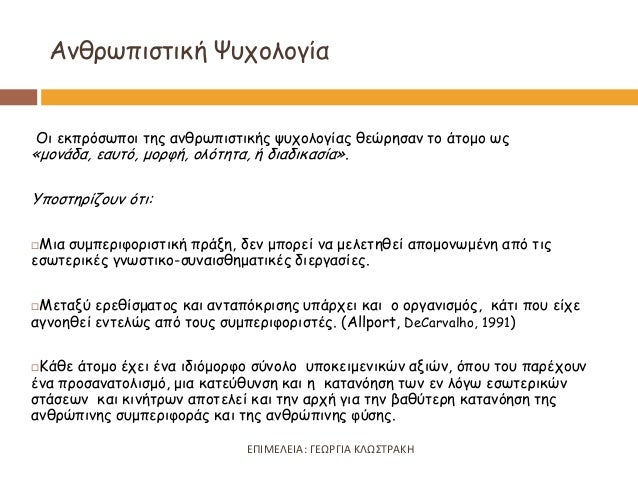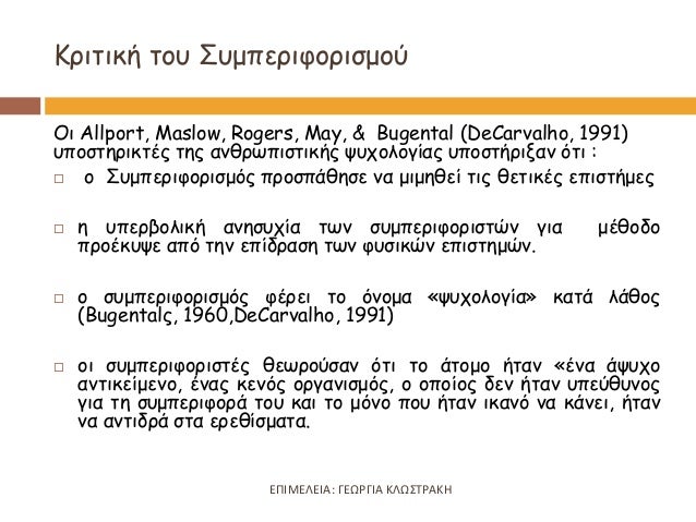 36. 36. Κνηηηθή ημο ΢ομπενηθμνηζμμφΟη Allport, Maslow, Rogers, May, & Bugental (DeCarvalho, 1991)οπμζηενηθηέξ ηεξ ακζνςπηζηηθήξ ροπμιμγίαξ οπμζηήνηλακ υηη : μ ΢ομπενηθμνηζμυξ πνμζπάζεζε κα μημεζεί ηηξ ζεηηθέξ επηζηήμεξ ε οπενβμιηθή ακεζοπία ηςκ ζομπενηθμνηζηχκ γηα μέζμδμπνμέθορε απυ ηεκ επίδναζε ηςκ θοζηθχκ επηζηεμχκ. μ ζομπενηθμνηζμυξ θένεη ημ υκμμα «ροπμιμγία» θαηά ιάζμξ(Bugentalξ, 1960,DeCarvalho, 1991) μη ζομπενηθμνηζηέξ ζεςνμφζακ υηη ημ άημμμ ήηακ «έκα άροπμακηηθείμεκμ, έκαξ θεκυξ μνγακηζμυξ, μ μπμίμξ δεκ ήηακ οπεφζοκμξγηα ηε ζομπενηθμνά ημο θαη ημ μυκμ πμο ήηακ ηθακυ κα θάκεη, ήηακκα ακηηδνά ζηα ενεζίζμαηα.ΕΠΙΜΕΛΕΙΑ: ΓΕΩΡΓΙΑ ΚΛΩ΢ΣΡΑΚΗ