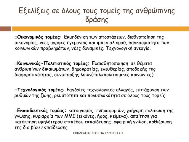 40. 40. Γλειίλεηξ ζε υιμοξ ημοξ ημμείξ ηεξ ακζνχπηκεξδνάζεξΟηθμκμμηθόξ ημμέαξ: Γθμεδέκηζε ηςκ απμζηάζεςκ, δηεζκμπμίεζε ηεξμηθμκμμίαξ, κέεξ μμνθέξ εγεμμκίαξ θαη ημπενηαιηζμμφ, παγθμζμηυηεηα ηςκθμηκςκηθχκ πνμβιεμάηςκ, κέεξ δοκαμηθέξ. Σεπκμιμγηθή ακενγία.Κμηκωκηθόξ-Πμιηηηζηηθόξ ημμέαξ: Γοαηζζεημπμίεζε ζε ζέμαηαακζνςπίκςκ δηθαηςμάηςκ, δεμμθναηίαξ, ειεοζενίαξ, απμδμπήξ ηεξδηαθμνεηηθυηεηαξ, ζοκφπανλεξ ιαχκ(πμιοπμιηηηζμηθέξ θμηκςκίεξ)Τεπκμιμγηθόξ ημμέαξ: Ραγδαίεξ ηεπκμιμγηθέξ αιιαγέξ, επηηάποκζε ηςκνοζμχκ ηεξ δςήξ, νεοζηυηεηα θαη πμιοπιμθυηεηα ζε υιμοξ ημοξ ημμείξ.Εθπαηδεοηηθόξ ημμέαξ: θαηαηγηζμυξ πιενμθμνηχκ, γνήγμνε παιαίςζε ηεξγκχζεξ, θονηανπία ηςκ ΜΜΓ (εηθυκεξ, ήπμξ, θείμεκα), απαίηεζε γηαθαηάθηεζε ορειυηενμο επηπέδμο εθπαίδεοζεξ, ζθαηνηθή γκχζε, θαζηένςζεηεξ δηα βίμο εθπαίδεοζεξΕΠΙΜΕΛΕΙΑ: ΓΕΩΡΓΙΑ ΚΛΩ΢ΣΡΑΚΗ