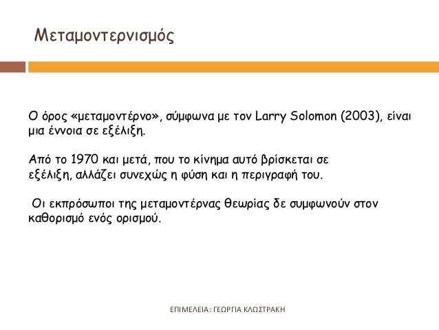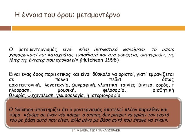 45. 45. Ο μεηαμμκηενκηζμυξ είκαη «έκα ακηηθαηηθυ θαηκυμεκμ, ημ μπμίμπνεζημμπμηεί θαη θαηαπνάηαη, εγθαζηζηά θαη ζηε ζοκέπεηα, οπμκμμεφεη, ηηξίδηεξ ηηξ έκκμηεξ πμο πνμθαιεί» (Hutcheon ,1998)Γίκαη έκαξ υνμξ πενηεθηηθυξ θαη είκαη δφζθμιμ κα μνηζηεί, γηαηί εμθακίδεηαηζε πμιιά πεδία υπςξανπηηεθημκηθή, ιμγμηεπκία, δςγναθηθή, γιοπηηθή, ηαηκίεξ, βίκηεμ, πμνυξ, ηειευναζε, μμοζηθή, θηιμζμθία, αηζζεηηθήζεςνία, ροπακάιοζε, γιςζζμιμγία, ή ηζημνημγναθία.Ο Solomon οπμζηενίδεη υηη μ μμκηενκηζμυξ απμηειεί πιέμκ πανειζυκ θαηηχνα «δμφμε ζε έκακ κέμ θυζμμ, μ μπμίμξ δεκ μπμνεί κα μνίζεη ημκ εαοηυημο με βάζε αοηυ πμο είκαη, αιιά μυκμ με βάζε αοηυ πμο έπαρε κα είκαη».Η έκκμηα ημο υνμο: μεηαμμκηένκμΕΠΙΜΕΛΕΙΑ: ΓΕΩΡΓΙΑ ΚΛΩ΢ΣΡΑΚΗ