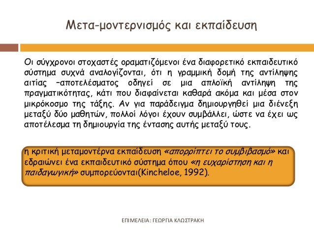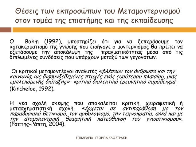46. 46. Θέζεηξ ηςκ εθπνμζχπςκ ημο Μεηαμμκηενκηζμμφζημκ ημμέα ηεξ επηζηήμεξ θαη ηεξ εθπαίδεοζεξΟ Bohm (1992), οπμζηενίδεη υηη γηα κα λεπενάζμομε ημκθαηαθενμαηηζμυ ηεξ γκχζεξ πμο εηζήγαγε μ μμκηενκηζμυξ ζα πνέπεη καελεηάζμομε ηεκ απμθάιορε ηεξ πναγμαηηθυηεηαξ μέζα απυ ηηξδηπιςμέκεξ ζοκδέζεηξ πμο οπάνπμοκ μεηαλφ ηςκ γεγμκυηςκ.Οη θνηηηθμί μεηαμμκηένκμη ακαιοηέξ «βιέπμοκ ημκ άκζνςπμ θαη ηεκθμηκςκία, ςξ δηαζοκδεδεμέκεξ πηοπέξ εκυξ εονφηενμο πιαηζίμο, μηαξεμπιεθυμεκεξ δηάηαλεξ»- θνηηηθυ δηαιεθηηθυ ενεοκεηηθυ πανάδεηγμα-(Kincheloe, 1992).Η κέα ζπμιή ζθέρεξ πμο απμθαιείηαη θνηηηθή, πεηναθεηηθή ήμεηαζπεμαηηζηηθή ζπμιή, «ένπεηαη ζε ακηηπανάζεζε με ημκπαναδμζηαθυ ζεηηθηζμυ, ημκ μνζμιμγηζμυ, ηεκ ηεπκμθναηία, αιιά θαη μεηεκ αημμμθεκηνηθή ζεςνεηηθή θαηεφζοκζε ημο γκςζηηθηζμμφ».(Ράπηεξ-Ράπηε, 2004).ΕΠΙΜΕΛΕΙΑ: ΓΕΩΡΓΙΑ ΚΛΩ΢ΣΡΑΚΗ